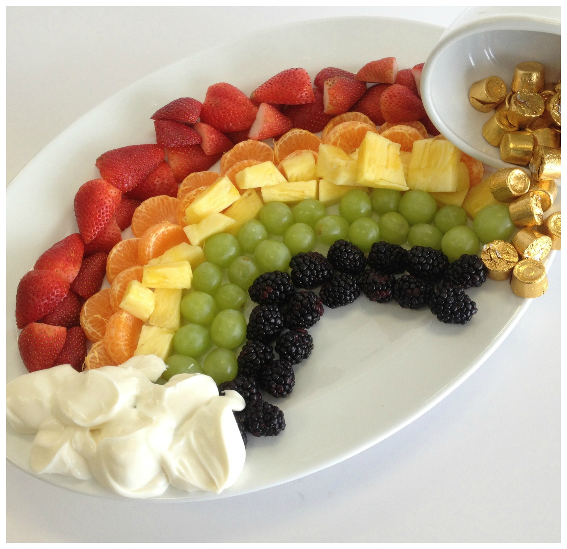 Веселая радуга из клубники мандаринов, бананов, винограда и ежевики станет настоящим лакомством для всех!