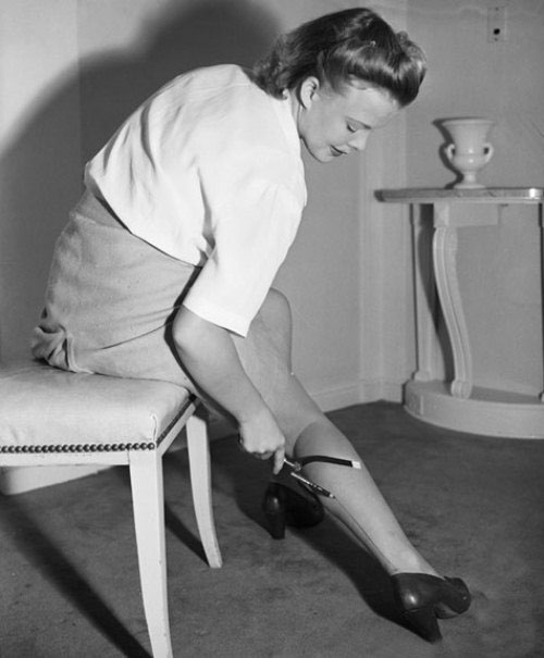 Во время войны чулки стали большой редкостью, производимый нейлон стал уходить в военную промышленность — к примеру, на производство парашютов. А ходить без чулок — вовсе было неприлично.