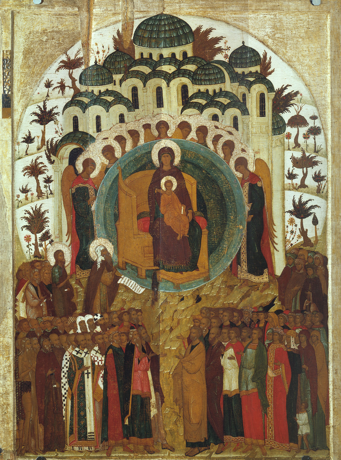 А на иконе «О Тебе радуется», например, вся фигура Богоматери вписана в круг (мандорлу) – символ Божественной славы. А затем очертания круга повторяются снова и снова – в стенах и главах храма, в ветвях райского сада, в полете таинственных, почти невидимых небесных сил на самом верху иконы.