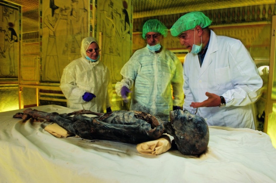 Ведущий археолог Египта Захи Хавасс (справа) с группой генетиков после извлечения костной ткани у одной из мумий, найденных в гробнице KV35 в Долине царей. Фото: Кеннет Гаррет